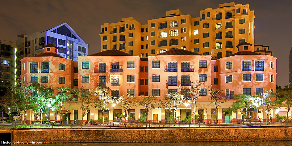Riverside View is a 99-year leasehold mixed development with 72 residential units and shop/restaurant units on the first storey situated next to the Singapore River, at 30 Robertson Quay. The residential units are located within a 4-storey low-rise and a 10-storey high-rise residential building possessing a neat symmetrical design of boxy blue-panel windows and balconies that overlook views of the river. The building is topped out by orange pyramid-shaped roofs and "cosy attics" which protrude from the rooftops.