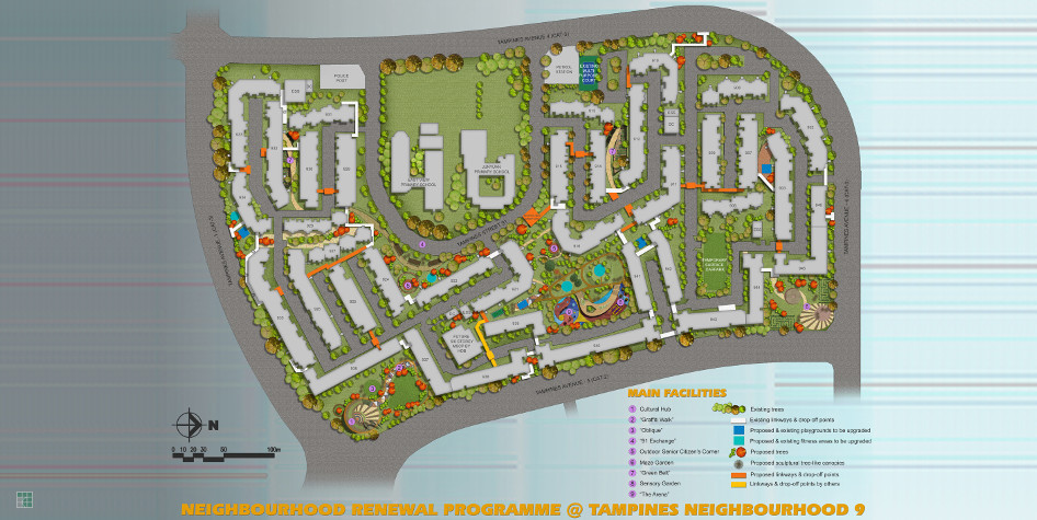 Team Design Architects won the largest neighbourhood renewal programme competition organised by the Tampines Town Council. The selection process involved feedback and comments received from participating households, then collated and analysed by a working committee. Through this process, our winning design titled 'The Gathering Place' secured popular voting majority. This project has the aim of pushing the boundaries of design to develop unique spaces that supports dynamic interactions and creative self-expressions, incorporating a variety of educational elements and which provide fun and engaging learning experiences for the residents. Exciting features include the Cultural Hub which is a circular walkway and metallic sculpture, the Graffiti Walk which allows residents a chance to showcase their artistic talents creatively in chalk, the 91 Exchange which allows residents to setup weekend shops for marketing their own goods, the Sensory Garden, Maze Garden and the Green Belt which provides horticultural garden spaces for residents to come closer with nature and to plant their own crops, and the Senior Citizen's Corner.