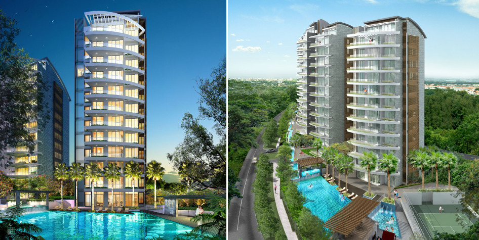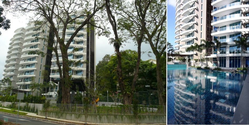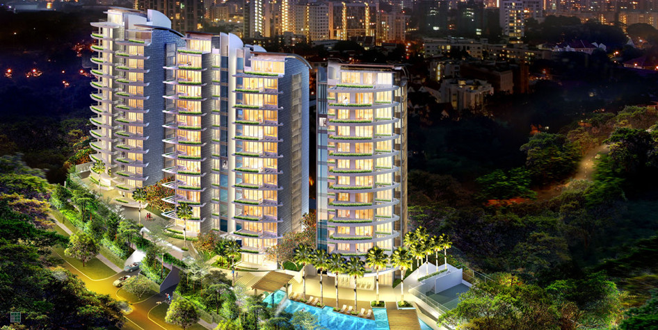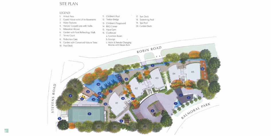 The Solitaire is an exclusive gem set in the heart of Balmoral Park. This 12/13 storey residential development was created from a joint collaboration between Team Design Architects and Carlos OTT. The interesting topography resulted in buildings designed to sit on a unique site with drastic slope descending according to natural terraced terrain from Balmoral Park Road towards Robin Road. 3 mature Tembusu trees are conserved at the junction of Robin/Stevens Road, which enhance the elegance of the new development. The result presents a sensitive building design both refreshing and unique, which captures a challenging terrain and terracing landscape features. A strong signature of the curved facade design of the buildings comes from the large curving balconies and trellis beam features as sun shading devices, in response to the curving Robin Road. The overall design creates individuality, and with private lift provisions to the 3 and 4 bedroom units, result in the exclusive solitaire feel.