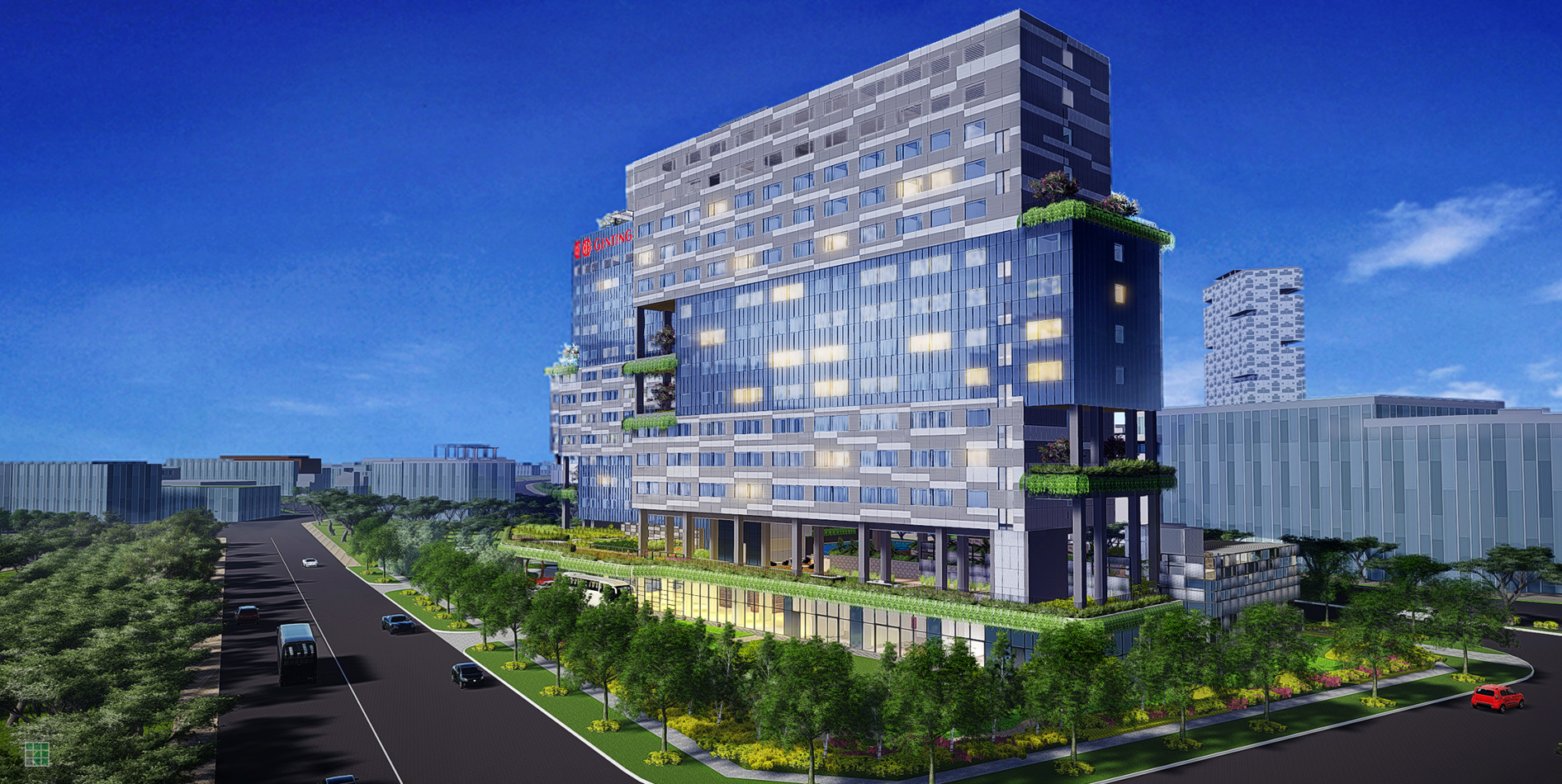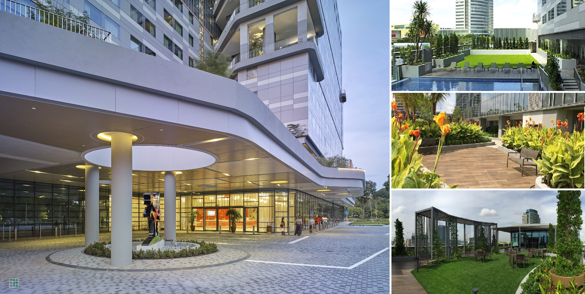 This hotel is expressed as a "Hotel in the Garden" design theme, to complement the lush tropical Jurong Lake district setting. The "Garden" includes extensive greenery and landscaping, with pockets of elevated sky terraces, spacious lawn and roof gardens which allow guests to enjoy expansive views of the Jurong Lake district. These verdant green spaces are found distributed around the 1st storey, 2nd storey, at the middle and ends of the hotel building. Designed for both business and leisure visitors, the 550-room hotel will have a contemporary look, with creative furnishings.