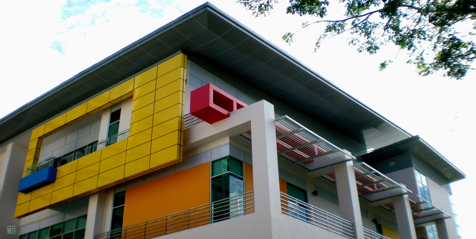 In creating a multi-purpose hall for the ever expanding Temasek Polytechnic, a cutting-edge creation of facade panels of Temasek's signature colours were designed, accented with bright focal points. Facade treatments imbue a sense of dynamism - in line with Temasek Polytechnic's reputation as the leading polytechnic in the South East Asian region.