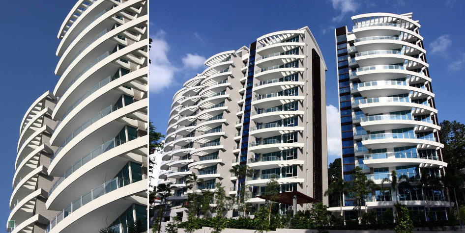 The Solitaire is an exclusive gem set in the heart of Balmoral Park. This 12/13 storey residential development was created from a joint collaboration between Team Design Architects and Carlos OTT. The interesting topography resulted in buildings designed to sit on a unique site with drastic slope descending according to natural terraced terrain from Balmoral Park Road towards Robin Road. 3 mature Tembusu trees are conserved at the junction of Robin/Stevens Road, which enhance the elegance of the new development. The result presents a sensitive building design both refreshing and unique, which captures a challenging terrain and terracing landscape features. A strong signature of the curved facade design of the buildings comes from the large curving balconies and trellis beam features as sun shading devices, in response to the curving Robin Road. The overall design creates individuality, and with private lift provisions to the 3 and 4 bedroom units, result in the exclusive solitaire feel.